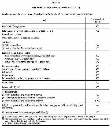 日前,歐盟正式實(shí)施了關(guān)于丙烯酰胺的法案COMMISSION REGULATION (EU) 2017/2158 。這個(gè)法案規(guī)定了包裝食品中允許含有丙烯酰胺的基準(zhǔn)含量,并要求制造商密切檢查并降低產(chǎn)品中的丙烯酰胺含量,涉及范圍包括馬鈴薯制品、面包、麥片、咖啡和咖啡替代品、嬰兒食品等。