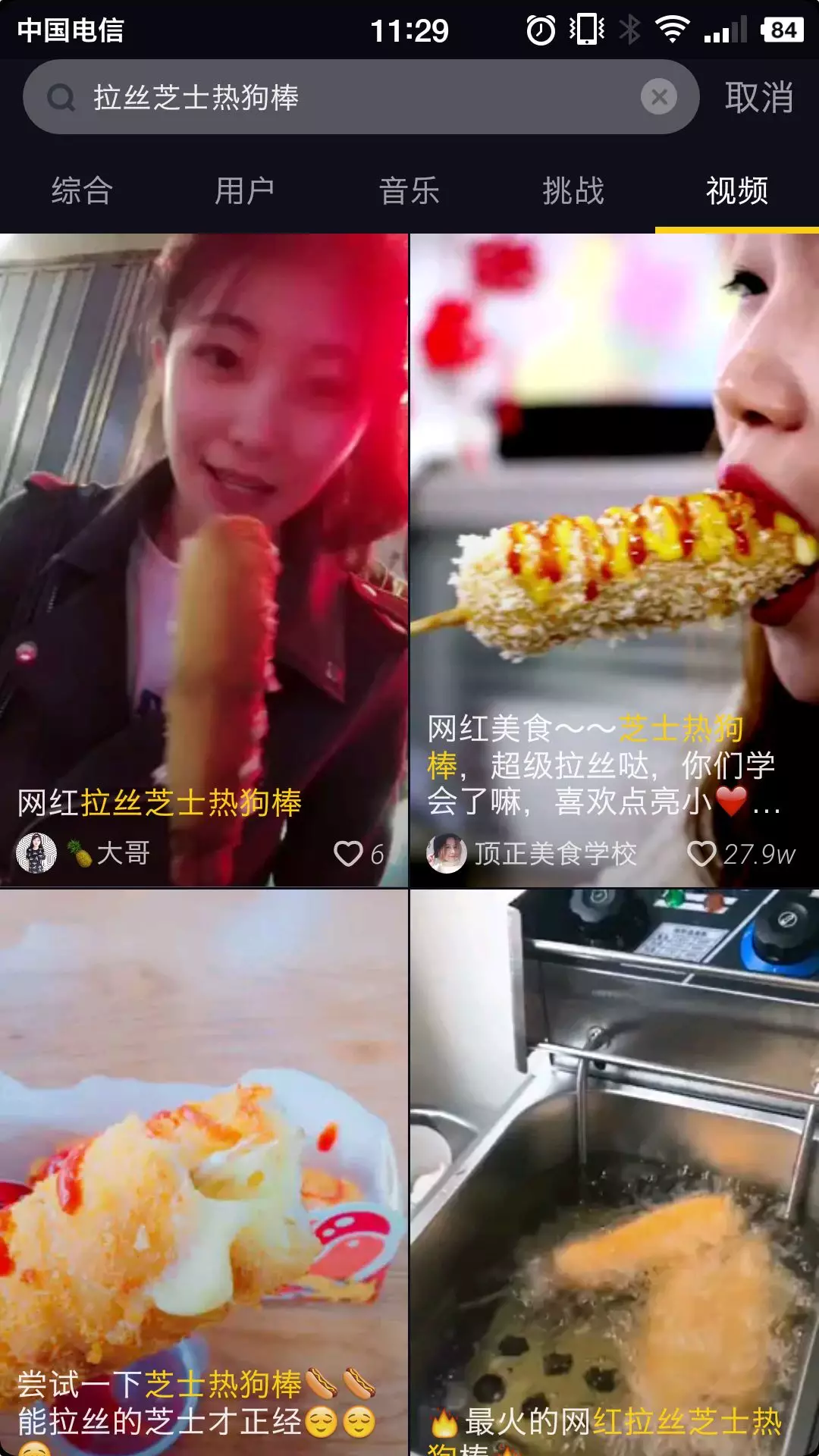 打開抖音,輸入關(guān)鍵詞“拉絲芝士熱狗棒”,由來自全國各地的美食愛好者們分享的教學(xué)視頻就會出現(xiàn)在下面。在這些時長15秒的短視頻中,分享者們會提前準(zhǔn)備好各種材料,然后步驟清晰、手法熟練地演示制作方法,整個過程看上去簡單易學(xué),即使“廚房黑洞星人”也能快速上手。