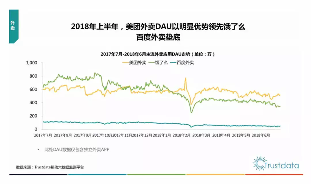 報(bào)告顯示,過(guò)去一年美團(tuán)外賣APP的DAU(日活躍用戶數(shù)量)呈現(xiàn)穩(wěn)中有升的態(tài)勢(shì);相比較下,餓了么的DAU則逐步下滑,百度外賣的DAU數(shù)據(jù)不斷探底。