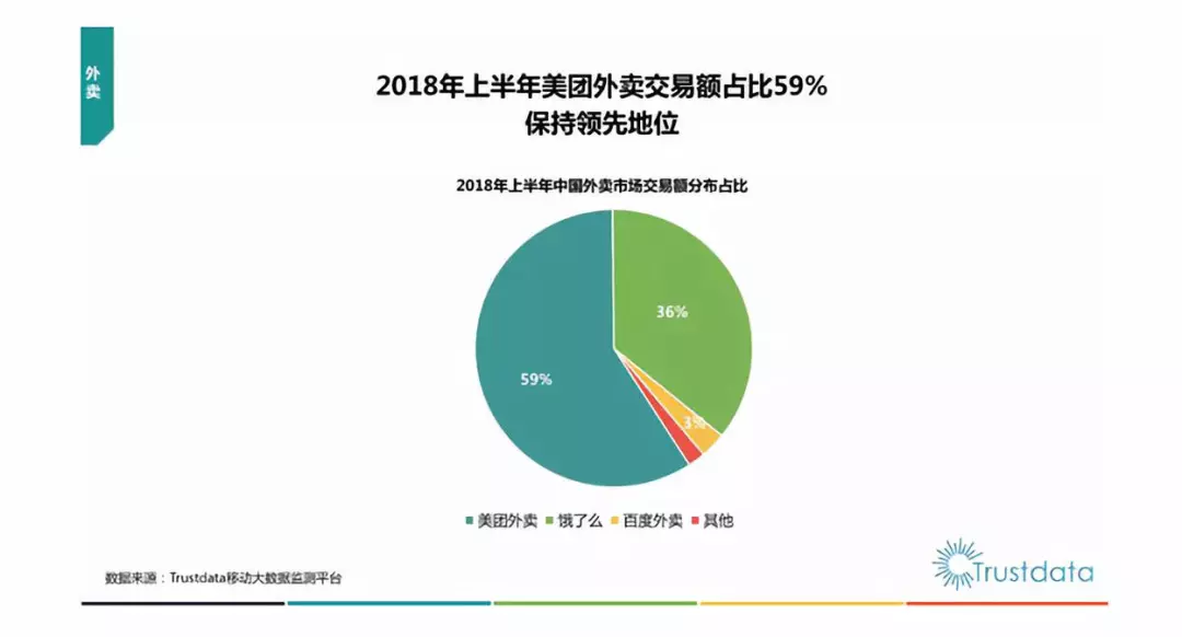 7月31日,數(shù)據(jù)監(jiān)測(cè)機(jī)構(gòu)Trustdata發(fā)布了《2018年上半年中國(guó)移動(dòng)互聯(lián)網(wǎng)行業(yè)發(fā)展分析報(bào)告》。報(bào)告顯示,2018年上半年,美團(tuán)外賣、餓了么和百度外賣的交易額占比分別為59%、36%和3%。目前,國(guó)內(nèi)外賣市場(chǎng)交易額已經(jīng)被頭部企業(yè)瓜分,外賣行業(yè)已經(jīng)建立起比較穩(wěn)定的“631”格局。