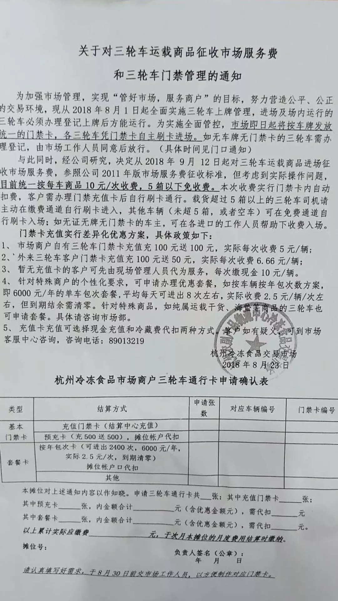 8月23日,杭州冷凍食品交易市場再發(fā)一則“關(guān)于對三輪車運(yùn)載商品征收市場服務(wù)費(fèi)和三輪車門禁管理”的書面通知,稱經(jīng)公司研究,決定從9月12日起,對載貨超5箱(5箱以下免費(fèi))的三輪車進(jìn)場征收10元/次的市場服務(wù)費(fèi),同時公布了充100元送100元、充100元送50元、或者6000元/年的單車包次套餐等一系列充值優(yōu)惠政策。