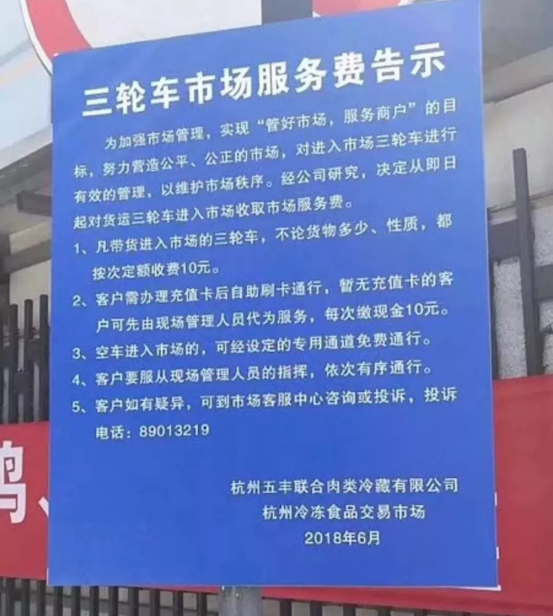6月初,杭州五豐聯(lián)合肉類冷藏有限公司、杭州冷凍食品交易市場的一則“三輪車市場服務(wù)費(fèi)”告示在經(jīng)銷商群體中引起了軒然大波!按照告示上的收費(fèi)標(biāo)準(zhǔn),帶貨三輪車進(jìn)一次市場要收費(fèi)10元。
