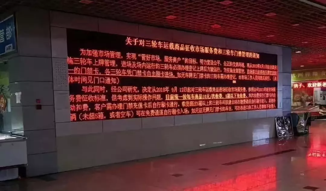 不少商戶表示是8月25日在門店收到這份書面通知,在市場內(nèi)平時發(fā)布公告信息的大屏幕上,也醒目地公布了這則收費(fèi)通知,滾動播出。見下圖: