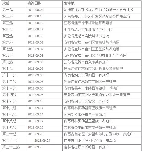 從2018年8月3日沈陽沈北確診的第一起非洲豬瘟到現(xiàn)在,一共發(fā)生了二十二起非洲豬瘟。隨后兩個月,非洲豬瘟便開始以點狀分布式在國內(nèi)出現(xiàn),其中安徽確診了八起,是迄今為止疫情發(fā)現(xiàn)最多的省份。