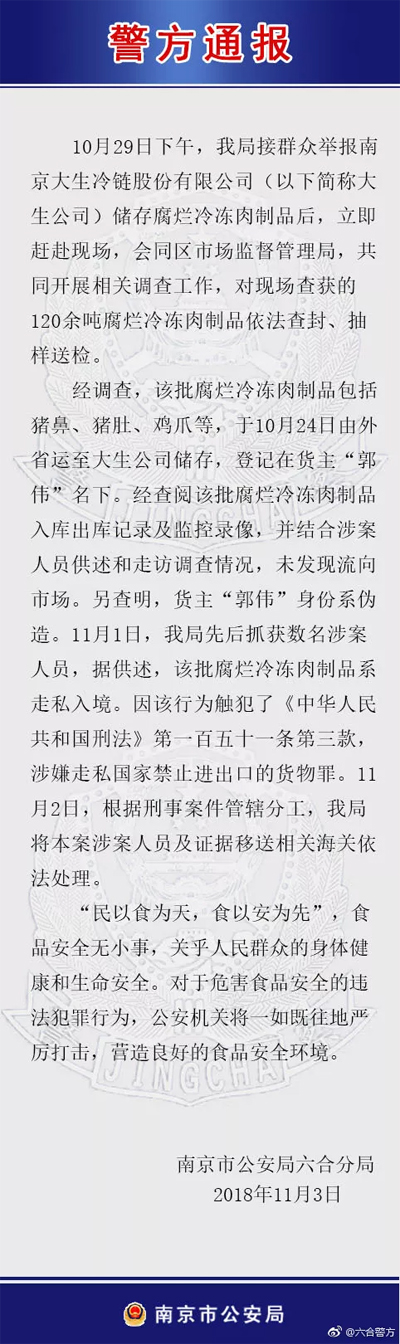 南京市公安局六合分局官方微博@六合警方發(fā)布關(guān)于南京大生冷鏈股份有限公司儲存腐爛冷凍肉制品調(diào)查情況的通報如下: