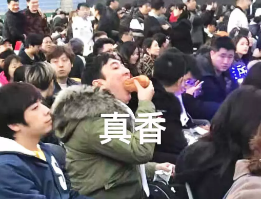 ▲國(guó)民老公風(fēng)靡全網(wǎng)的吃熱狗現(xiàn)場(chǎng)。不過(guò)這是面包加腸