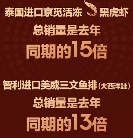 其中,泰國海產(chǎn)總銷量是去年同期6倍;智利共計售出56噸海鮮水產(chǎn),是去年同期的5倍;挪威海產(chǎn)銷量達30000件,其中僅三文魚便占到了總銷量的30%;加拿大大龍蝦共計賣出12噸,頭尾相連可繞天安門廣場三圈;自營法國生蠔銷量是去年同期的15倍……