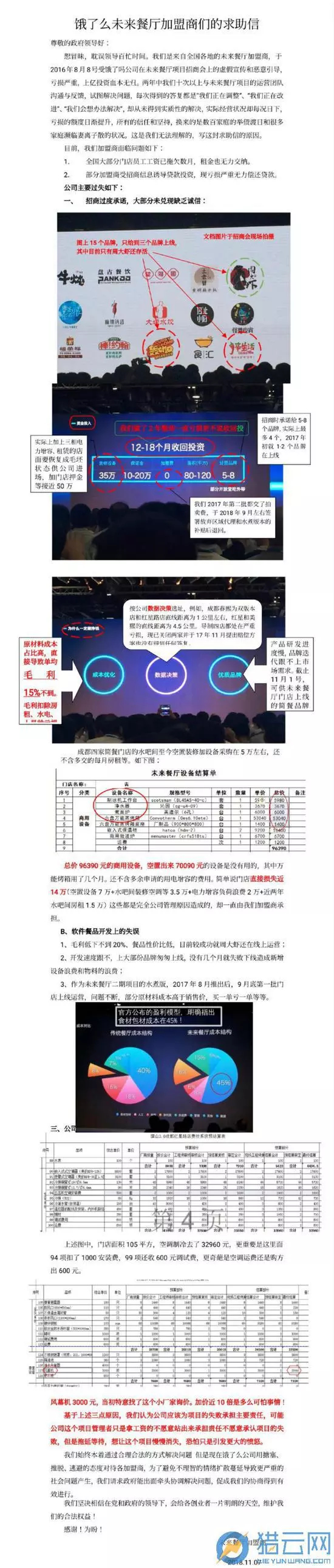 在一封加盟商向政府提交的求助信里有提到,2016年8月8號(hào)受餓了么在未來(lái)餐廳項(xiàng)目招商會(huì)上的虛假宣傳和惡意引導(dǎo),虧損嚴(yán)重,上億投資血本無(wú)歸。