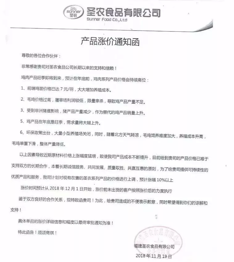 白羽雞上市公司圣農(nóng)食品發(fā)布了漲價通知,稱因受到非洲豬瘟影響,豬產(chǎn)品產(chǎn)量減少,作為替代品的雞產(chǎn)品銷量上升;與此同時,大量小型養(yǎng)殖場因環(huán)保原因關閉、加上北方天氣轉涼、養(yǎng)殖成本升高,造成了整體毛雞產(chǎn)量變低。“計劃對現(xiàn)有在售的圣農(nóng)系列產(chǎn)品價格上調10%以上。”
