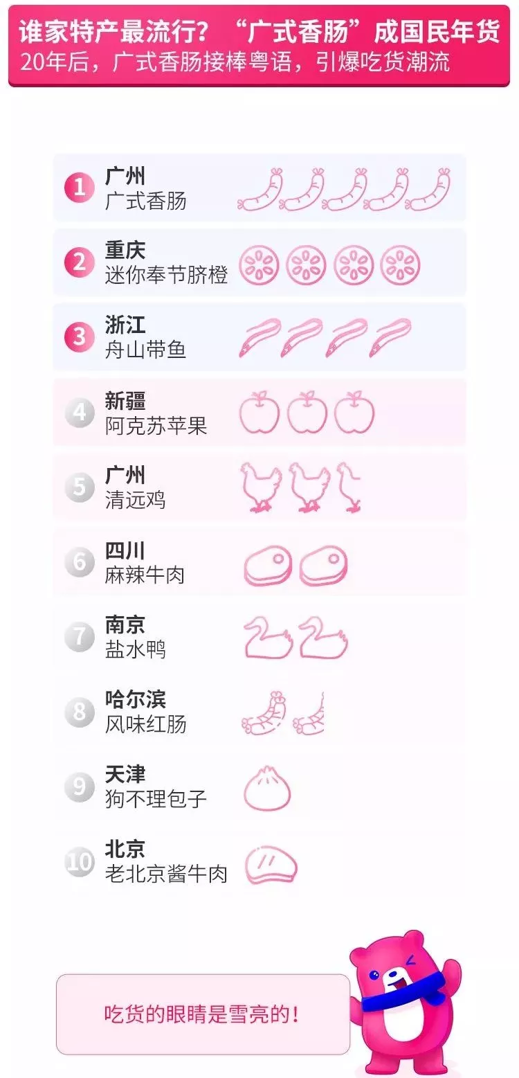 數(shù)據(jù)顯示,在所有地方的特產(chǎn)中,廣式香腸憑借銷量冠軍成為當之無愧的“國民年貨”。此外,重慶奉節(jié)臍橙、浙江舟山帶魚、新疆阿克蘇蘋果、廣州清遠雞緊跟其后。