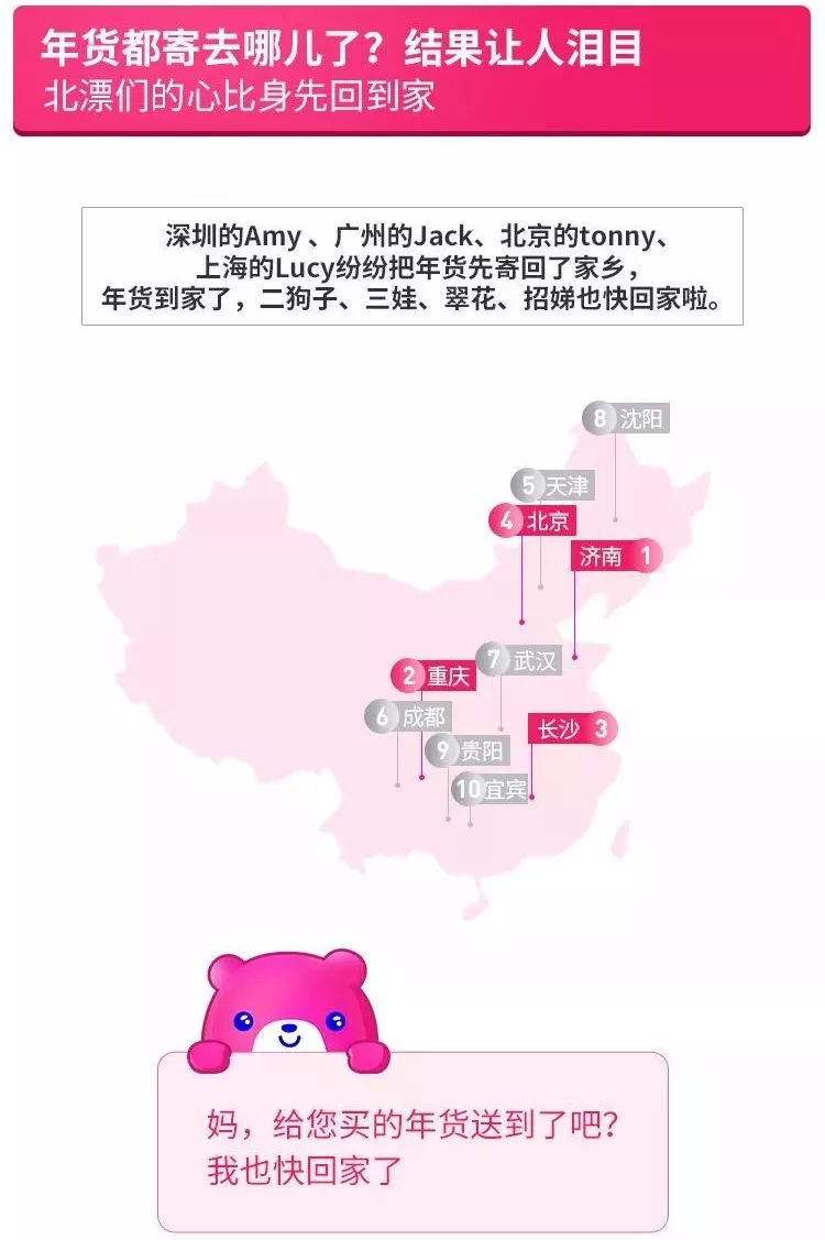 年貨比人先到家已經(jīng)成為很多“漂”們的新選擇。在外辛苦工作一年的“漂們”,思鄉(xiāng)情緒在春節(jié)前集中爆發(fā),他們大多數(shù)會選擇提前為遠方的親人挑選年貨,把愛和牽掛郵寄回家。數(shù)據(jù)顯示,超過9成外地工作的用戶會線上購買年貨禮盒寄回家鄉(xiāng),其中濟南、長沙、重慶成為收到年貨禮盒最多的城市。
