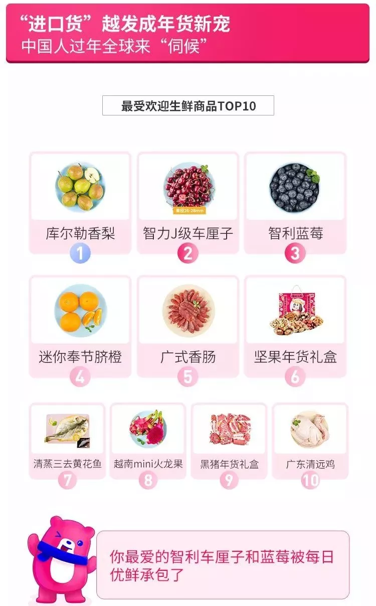 從整體生鮮品類來看,水果、肉類和乳品占據(jù)品類TOP榜前三位置。隨著國人飲食日益健康化,水果的受歡迎程度持續(xù)走高,占比約為25.7%。值得注意的是,在最受歡迎的十大生鮮年貨商品排行中,庫爾勒香梨、廣式香腸、黑豬年貨禮盒、智利車厘子、智利藍莓、越南mini火龍果排名靠前,成為國人年貨新寵。