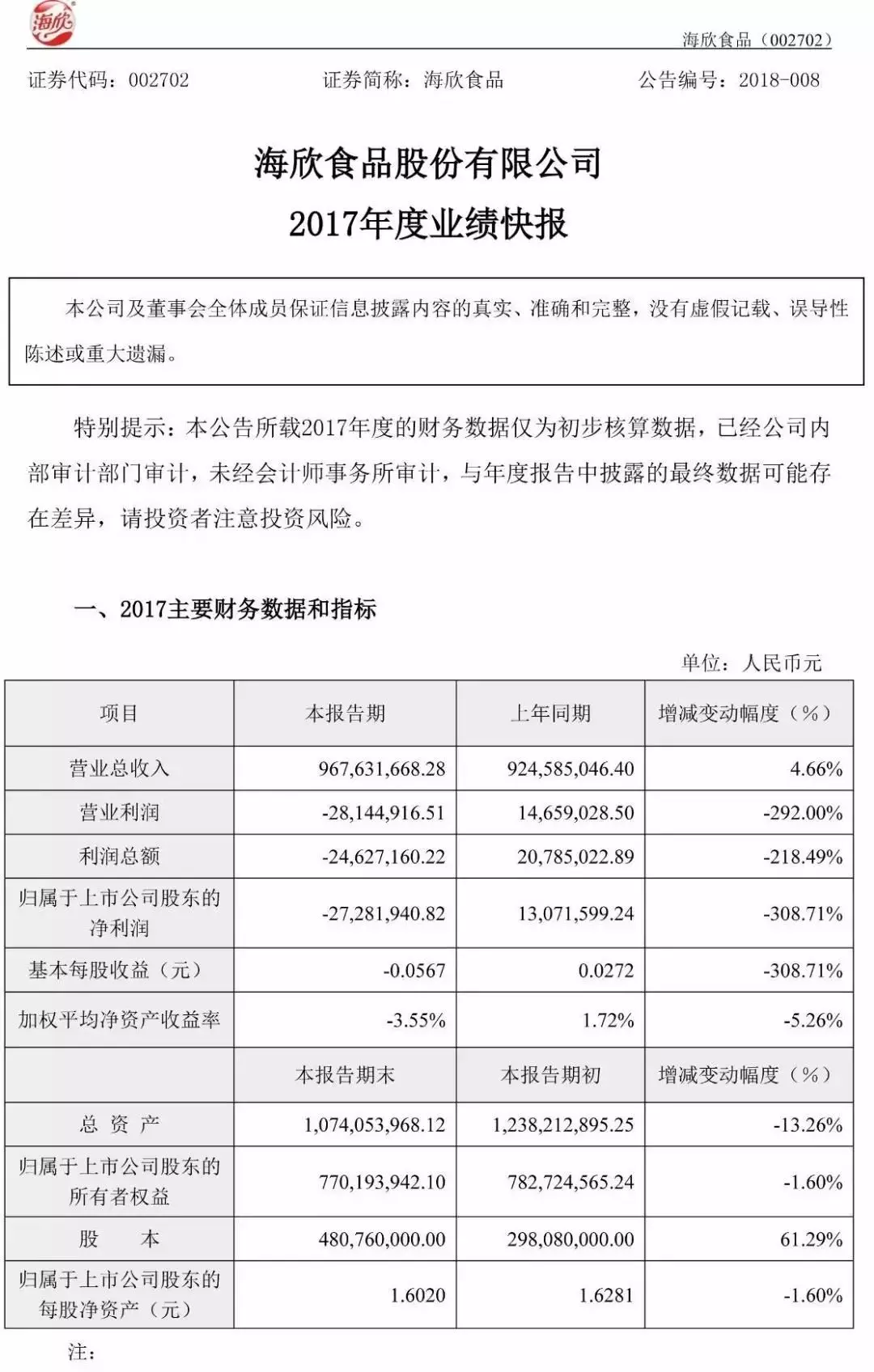2月28日,海欣食品股份有限公司發(fā)布2017年度業(yè)績快報,經(jīng)初步核算,報告期內(nèi),公司實現(xiàn)營業(yè)收入96763.17萬元,較上年同期增長4.66%,營業(yè)利潤2814.49萬元,較上年同期下降292%。歸屬上市公司股東的凈利潤-2728.19萬元,較上年同期下降308.71%。
