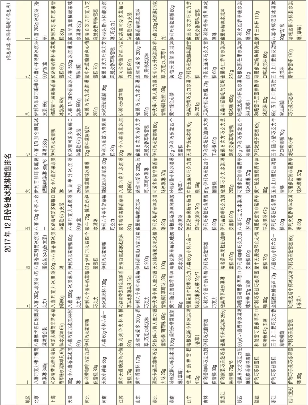 來源: 冷凍食品網(wǎng) 發(fā)布者:編輯▼2017年12月份各地冰淇淋銷售排名