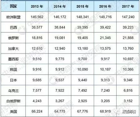 2013-2017年全球豬肉銷(xiāo)量分國(guó)家統(tǒng)計(jì)表(千噸)