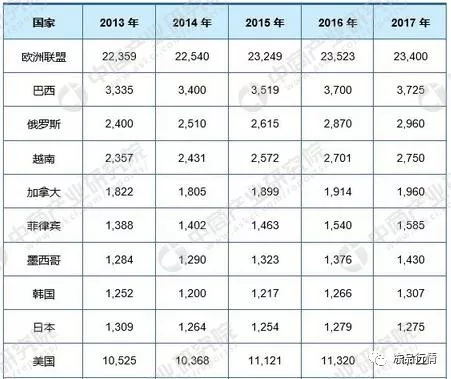 2013-2017年全球生豬出欄量分國(guó)家統(tǒng)計(jì)(千頭)