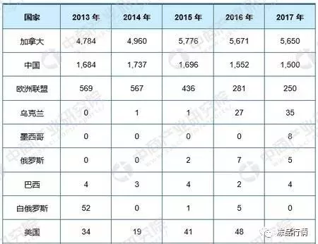 2013-2017年全球豬肉出口量分國(guó)家統(tǒng)計(jì)表(千噸)