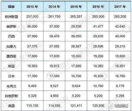 2013-2017年全球豬肉產(chǎn)量分國(guó)家統(tǒng)計(jì)表(千噸)