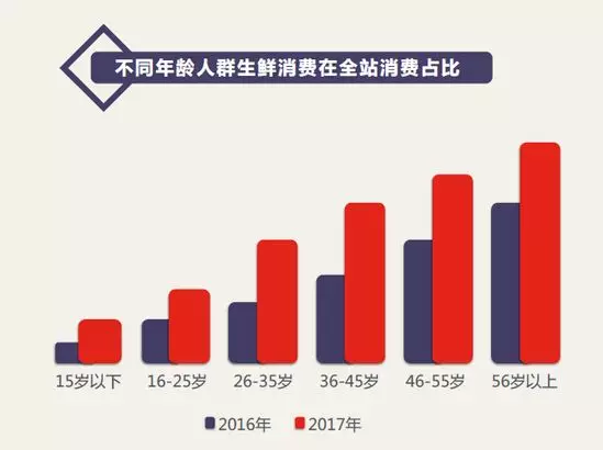 對(duì)比不同年齡段用戶(hù)在京東平臺(tái)的消費(fèi)結(jié)構(gòu)發(fā)現(xiàn),50后、60后和70后用戶(hù)的生鮮消費(fèi)在其京東全站消費(fèi)占比最高,可見(jiàn)“銀發(fā)經(jīng)濟(jì)”效應(yīng)在生鮮電商領(lǐng)域更為明顯,網(wǎng)上買(mǎi)菜、買(mǎi)肉的習(xí)慣也在逐步取代菜市場(chǎng)在中老年人心里的地位。