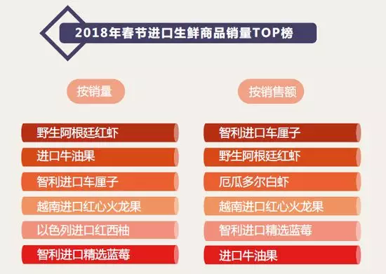 2018年春節(jié)期間,按照銷(xiāo)售額排序,最受歡迎的進(jìn)口生鮮商品為:智利進(jìn)口車(chē)?yán)遄?、野生阿根廷紅蝦、厄瓜多爾白蝦、越南進(jìn)口紅心火龍果和智利進(jìn)口精選藍(lán)莓。