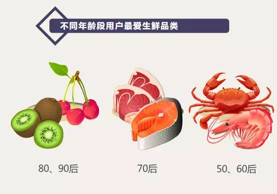 京東大數(shù)據(jù)發(fā)現(xiàn),80后、90后愛(ài)買(mǎi)水果,奇異果/獼猴桃、車(chē)?yán)遄邮撬麄兊淖類(lèi)?ài);70后偏愛(ài)買(mǎi)豬牛羊雞肉和蛋類(lèi);50后和60后愛(ài)買(mǎi)海鮮水產(chǎn),其中以魚(yú)類(lèi)和蝦類(lèi)居多。