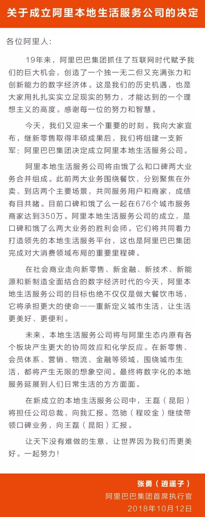 阿里CEO張勇在員工信中寫道:“在社會(huì)商業(yè)走向新零售、新金融、新技術(shù)、新能源和新制造全面結(jié)合的數(shù)字經(jīng)濟(jì)時(shí)代的今天,阿里本地生活服務(wù)公司的目標(biāo)也絕不僅僅是做大餐飲市場(chǎng),它將承擔(dān)更大的使命——重新定義城市生活,讓生活更美好、更便利。”