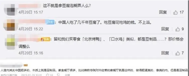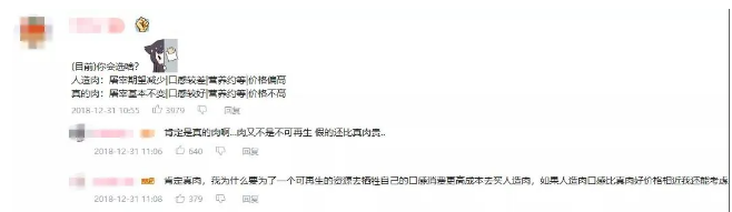 在B站、微博、微信上,“人造肉”相關(guān)內(nèi)容的評論欄中,消費者對其詬病主要集中在三個部分:價格貴、口感差、沒肉味。而這實際上也是目前阻礙中國“人造肉”企業(yè)發(fā)展、并且各個企業(yè)和研發(fā)機(jī)構(gòu)在攻克的三個維度。